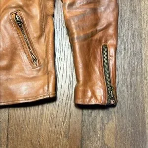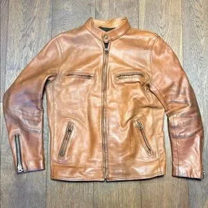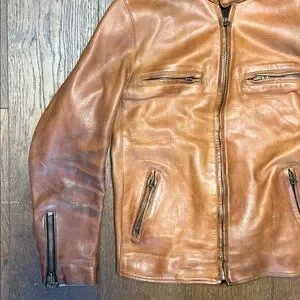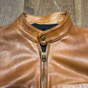 Thick, vintage, heavy and robust best describes this whiskey leather tone cafe racer jacket by Hondo Huntley (Curated).