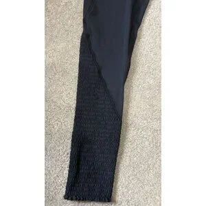 Step into comfort and style with these sleek Free People black leggings, perfect for a range of activities from pilates to casual outings. Crafted from a blend of polyester, nylon, and spandex, these leggings offer a snug yet flexible fit, ensuring you move with ease whether you're at the gym or on the go.The leggings feature a mid-rise cut with a comfortable inseam of 26 inches, making them an ideal choice for those who value both fashion and function. Smocked at the bottom for extra style. The solid black color and ankle style allow for versatile outfit combinations, while the smocked detail at the bottom of the leg adds a touch of texture and sophistication. Embrace the athleisure trend with these versatile, medium-sized leggings that are sure to become a go-to in your wardrobe.