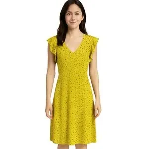 Ann Taylor Dress PXXS Yellow Floral A-Line V-Neck Ruffle Sleeve Stretch Chic NEW