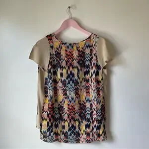100% silk short sleeve flowy blouse by Anthropologie brand- Maeve with a abstract multicolor print on the gorse and back, while the sleeves and strip of the side panels are a solid tan color. Unique and fun top, and the silk fabric feels lovely to the touch! Excellent preowned condition. Size medium.