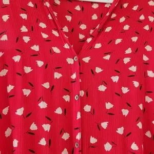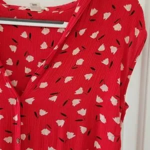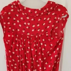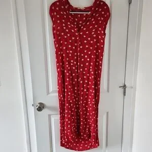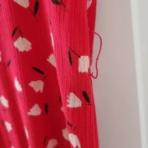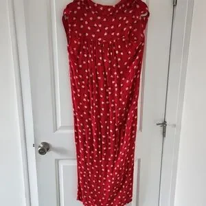 Charming red sleeveless maxi dress with an all-over white floral print. Lightweight, drapey fabric creates an easy, flattering silhouette. Ideal for casual outings or relaxed weekend wear. Excellent condition. There is a string loop on the right side that could hold a small belt, but no belt is included. See photos for details.