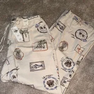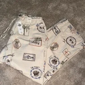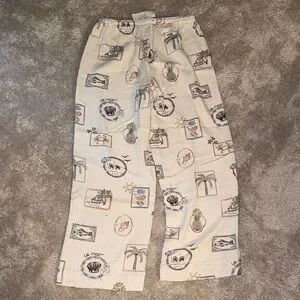 Cream lounge pants with a mixed tropical stamp print. Elastic waistband for easy wear. Relaxed straight leg silhouette. Fun motifs include palm trees, pineapples, shells, and seaside scenes.
