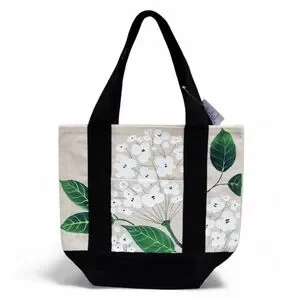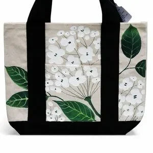Beautiful hand-painted canvas tote bag featuring an elegant white hydrangea floral design.