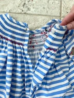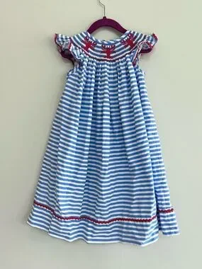 Make a splash in our Lobster Treasures Smocked Blue Stripe Angel Sleeve Dress! This adorable blue stripe dress is full of seaside charm, featuring playful red crab smocking and angel-style sleeves with red ric rac trim. Perfect for beach vacations, family getaways, or any summer adventure!