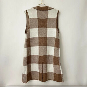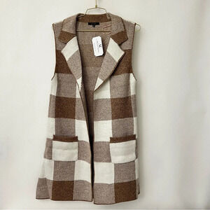 Open Front Sweater Vest Plaid Long Cardigan Heather Brown With Pockets Large