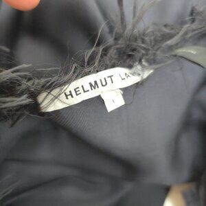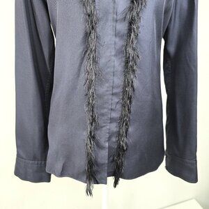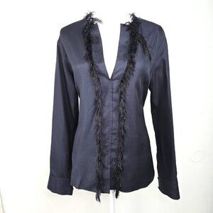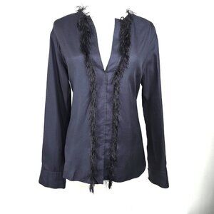 Helmut Lang Black Navy Twill Fringe Feather Silk Long Sleeve Blouse