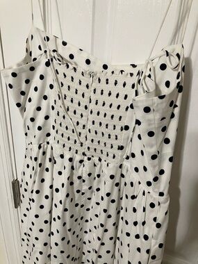 Classic white midi dress with black polka dots. Spaghetti straps and a fitted bodice with multiple seams to accommodate bust with structure. Beautiful flared skirt which can be dramatized with an underskirt or worn plain. Timeless, feminine silhouette. Easy to style for day or evening.