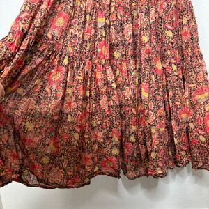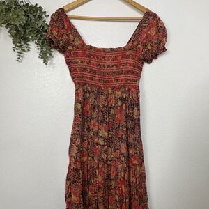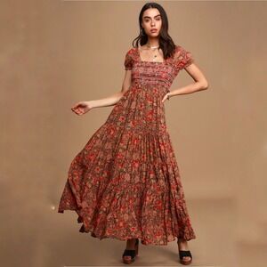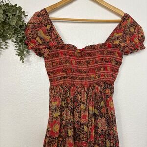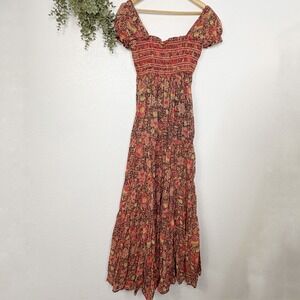 Free People Getaway Red Floral Print Tiered Maxi Dress Smocked XS