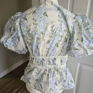 Light blue and cream floral blouse with puff sleeves. Tie-front and waist corset ties create shape. Peplum hem adds a feminine flair. Soft floral print for a delicate look. purchased form a boutique but I never wore it.