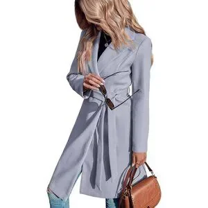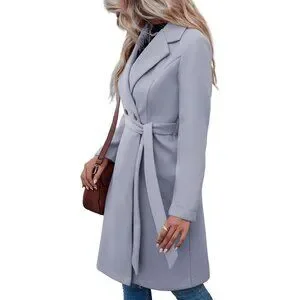 Womens Grey Pea Notched Lapel Double Breasted Business Casual Trench Coats