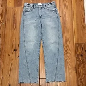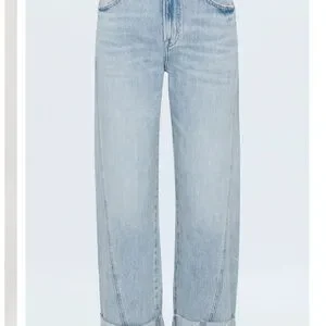 Relaxed boyfriend fit. Light wash blue denim with cuffed hem. Classic five-pocket styling. Casual, everyday denim look.