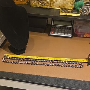 Striking vintage cloisonné bead necklace with navy blue beads. Pink floral enamel accents on each bead. Smooth round beads strung in a continuous loop. Elegant, colorful statement piece.
