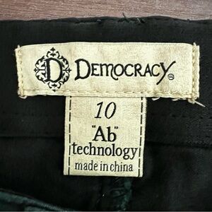 The product is a pair of Democracy Ab Technology ankle skinny jeans in size 10, featuring a solid green color and a mid-rise fit. Made from a cotton/polyester blend fabric, these jeans are designed to be slimming and are accented with ankle skinny detailing. The zip closure and 25.5-inch inseam make them a stylish and comfortable choice for women looking for a flattering pair of jeans.