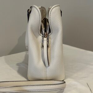Structured kate spade shoulder bag with woven front panel. Pebbled white leather sides and straps. Top handles and detachable long strap. Sleek, refined shape for everyday wear.