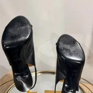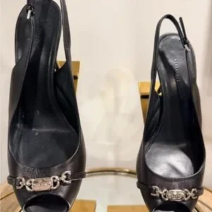 Elegant Gucci slingback pumps in smooth black leather. Open peep-toe with a silver-tone chain plaque accent. Slim slingback strap for secure wear. Sleek silhouette perfect for polished outfits.