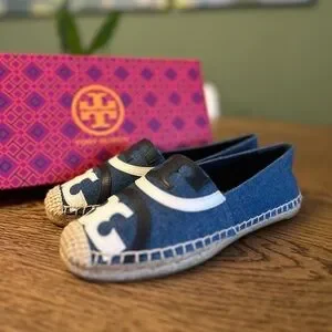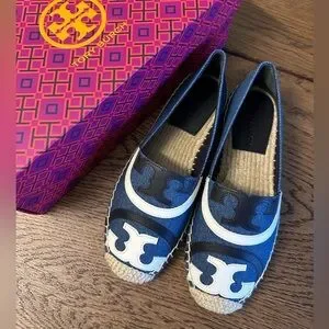 Stylish Tory Burch espadrilles in blue with white and black accents. Perfect for casual outings.