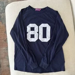 Classic navy long-sleeve tee. Large white '80' front applique for a sporty look. Crew neckline and ribbed cuffs. Versatile casual piece.