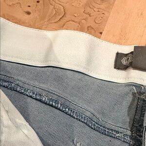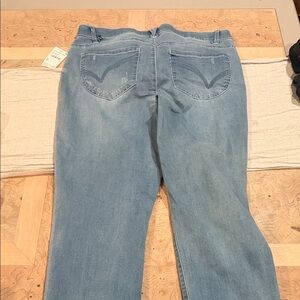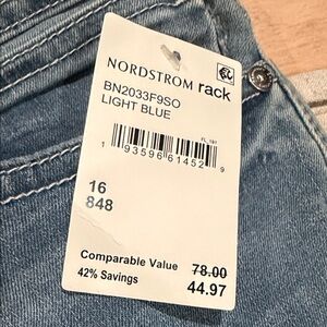 Straight leg cut with subtle distressing at the pockets. Light wash denim with soft fading. Comfortable mid-rise for everyday wear. Classic five-pocket styling.