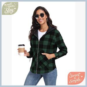 Women's Plaid Fleece Jacket Hooded Full Zip Casual Fall Winter Warm