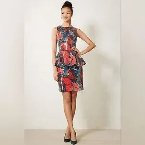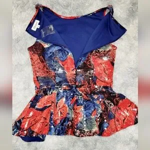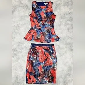 Features a bold, floral-inspired print in shades of red, blue, and black, embellished with all-over sequins. Fully lined. Includes a sleeveless peplum top featuring a round neckline and a hidden zipper closure at the back. The matching pencil skirt has a hidden back zip and measures around 21 inches in length. The spandex ling offers a slight stretch. True to size.