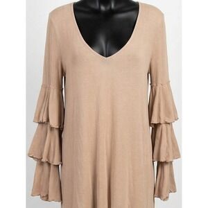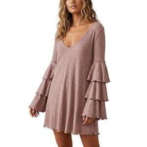 FREE PEOPLE FP BEACH Seashore Ruffle Mini Dress Mauve Ribbed Tiered Sleeve Small