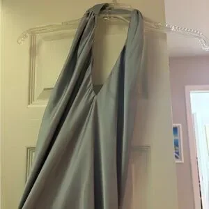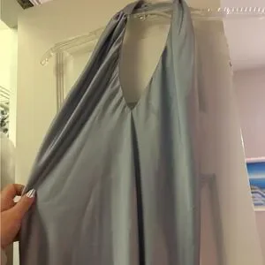 Twist halter neckline with gathered detail. Smooth satin fabric with a subtle sheen. Streamlined midi silhouette for elegant wear. Soft light blue color feels airy and refined.