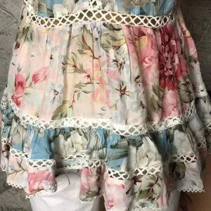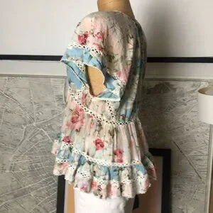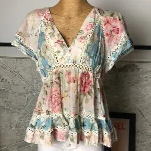 NWOT excellent condition size 3 fits M-L This beautiful floral top features a delicate lace trim, perfect for adding a touch of elegance to your wardrobe. The soft pink and blue hues create a charming look.