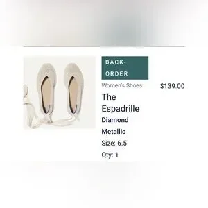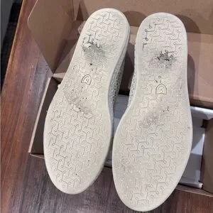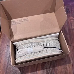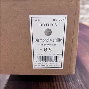 Rothy’s The Espadrille Diamond Metallic Flat. Cream color with metallic shimmer. Also comes with ankle ties. One time wear. excellent condition aside from bottom of shoe as shown in pics.