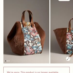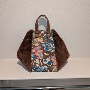 Sold out! Super soft fur edged tote bag with floral tapestry center panel. Smooth brown leather-like handles and an adjustable shoulder strap.