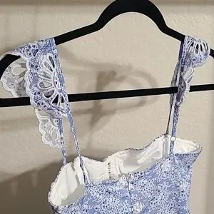 Light blue midi dress with white floral lace cutwork. Spaghetti straps with crochet detailing. Feminine silhouette and airy skirt. Perfect for spring or summer events.