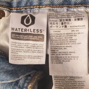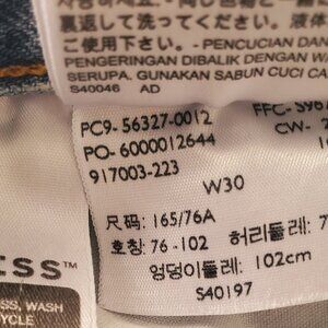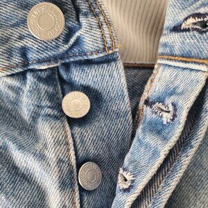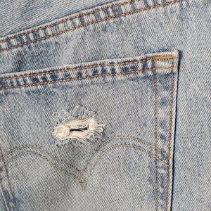 Light medium stonewashed denim, 5 pocket style, 501 button fly closure, mid to higher rise, distressing all over, as pictured, cut off raw hem that slightly cuffs, 100% cotton, machine washable. Good pre-owned condition. Women's size 30 (10-12)