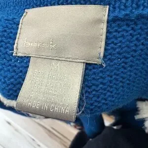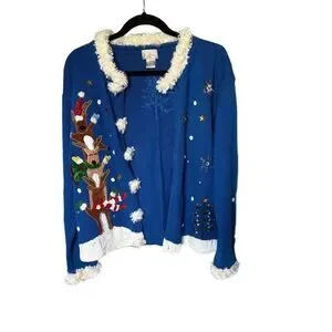 Berek Cardigan Sweater Womens Size M Blue Multicolor Christmas Ugly Sweater Embroidered Stacked Reindeer Festive Cozy
