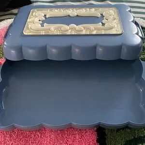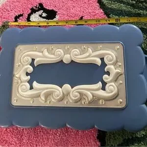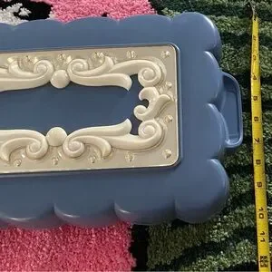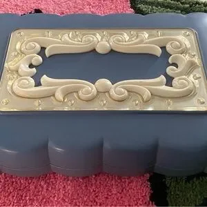 Stylish blue jewelry box with an ornate cream accent on the lid. Compact and practical for organizing necklaces, rings, and small accessories. Lightweight design for easy storage and everyday use.