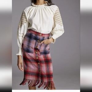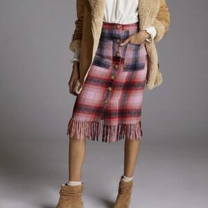 A stylish plaid skirt featuring pink red and blue tones with button-front detail. Soft woven fabric and fringe hem add a feminine, on-trend finish. Versatile design that pairs easily with sweaters, blouses, and boots for seasonal outfits. NWT Sz 14