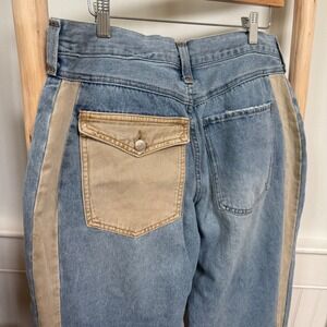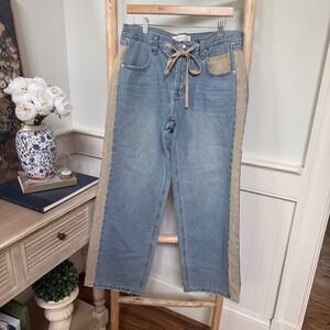 Light wash denim jeans feature a unique two-tone design with tan twill side stripes and a matching buttoned back pocket. The relaxed, wide-leg silhouette is accented by a functional drawstring waist with grommet details and a classic five-pocket construction. Distressing at the hems adds a lived-in, vintage feel to this eclectic piece.