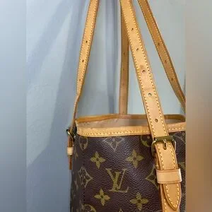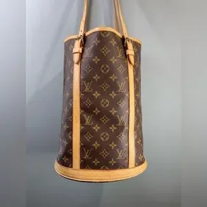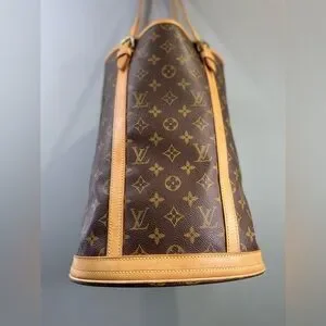 Classic monogram canvas bucket silhouette. Tan leather trim and adjustable shoulder straps. Structured vertical shape with signature LV pattern. Elegant, versatile for daily use.