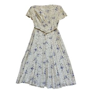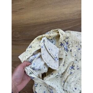 Vintage DJI butter yellow floral midi dress features a retro modest silhouette with a classic button-down front and a flattering tie-back waist. Crafted from lightweight rayon, this short-sleeve piece includes subtle shoulder pads for a structured 90s look and a delicate purple floral print throughout. Perfect for cottagecore or prairie-inspired styling, this flowy dress offers a timeless aesthetic with a comfortable, airy feel.