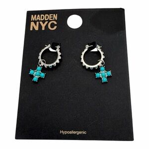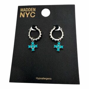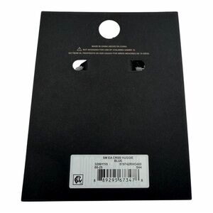Trendy silver tone huggie hoop earrings with blue cross charms for a stylish pop of color. These small hoops feature a textured edge with a dangling beaded cross detail—perfect for everyday wear or layering with other earrings.
