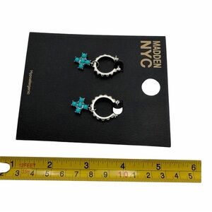 Silver Huggie Hoop Earrings Blue Cross Charm Dangle