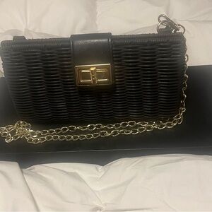 Black Woven Crossbody Bag with Gold Chain Strap