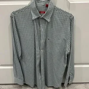 Classic Izod button-up with a small green and white check pattern. Long sleeves with a standard collar. Clean, versatile style suitable for casual or office wear.