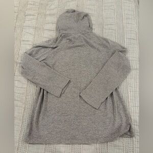 Lightweight and cozy hooded cardigan featuring a full button-front closure and convenient front pockets. Soft polyester/spandex blend with great stretch. Good used condition with no noted flaws—perfect for layering year-round.