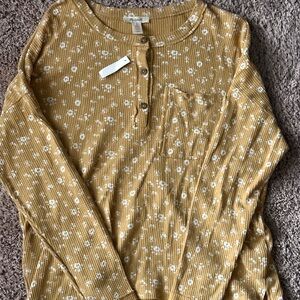 Soft ribbed henley with small white floral print. Front pocket detail and button placket. Lightweight and casual. Versatile mustard color.