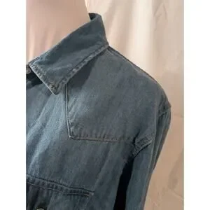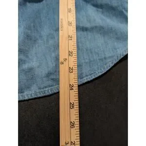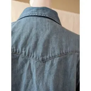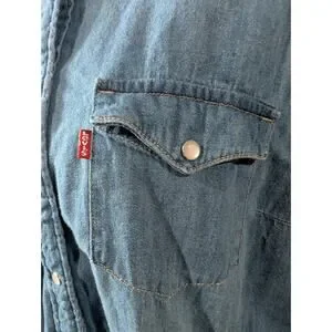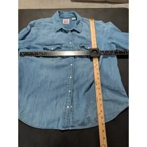This Levi's Denim Shirt for women in size XL features a collared neckline with pearl snaps for closure, making it suitable for casual, travel, and workwear occasions. The shirt is crafted from denim fabric with a solid blue colour and accented with button and snap details. With a Western theme inspired by rodeo, cowboy, and classic 90s retro style, this shirt is a versatile wardrobe essential that can be worn in all seasons and includes pockets for added functionality. Machine washable and made from cotton, this Levi's denim shirt offers a regular fit for a comfortable and stylish look.