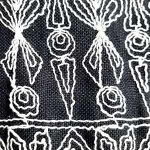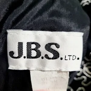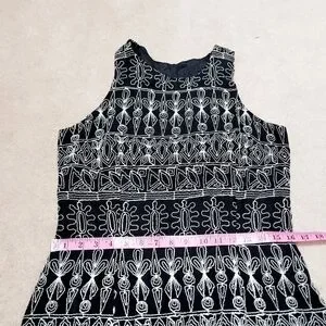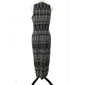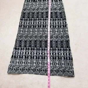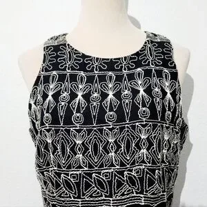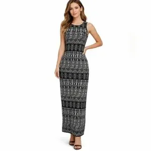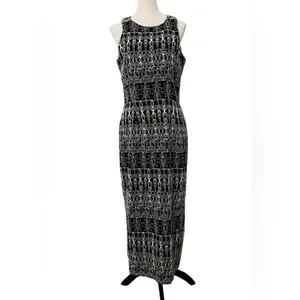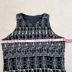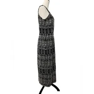 True vintage J.B.S. Ltd maxi dress featuring a bold black and white embroidered-style pattern with an ethnic/boho inspired design. Sleeveless cut with a round neckline and a long, straight silhouette for a timeless look. Made in the USA, showcasing quality vintage craftsmanship and unique patterning not found in modern fast fashion.