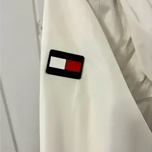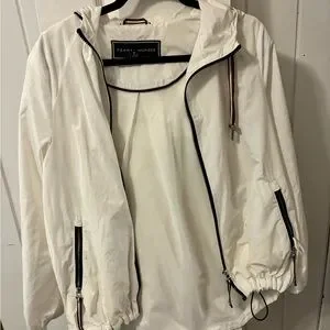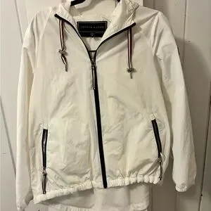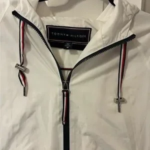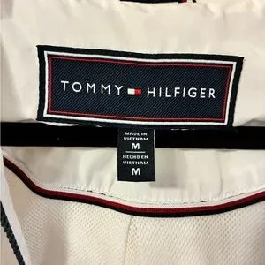 Tommy Hilfiger vintage White hooded shell jacket by Tommy Hilfiger. Front zipper closure with navy-trimmed zip. Red-white-blue drawcord accents and metal aglets. Minimal, sporty look for everyday wear.