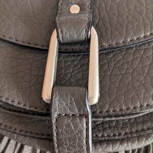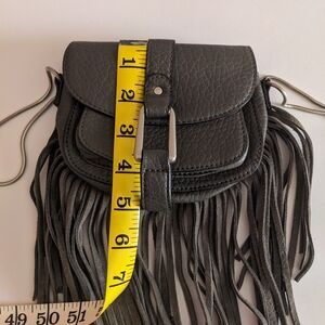 Stylish MINI grey fringe crossbody bag with a buckle front detail. Soft textured finish and flowing fringe create a chic, boho look. Lightweight and versatile for everyday wear. Grey color complements casual and dressy outfits. New, never worn.