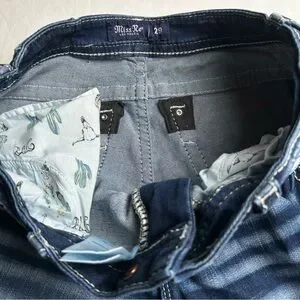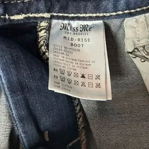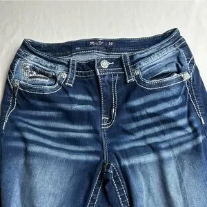 Miss Me women’s flare jeans in a dark blue wash. Fading at thighs and whisker details. Flared leg with decorative contrast stitching. Stylish and flattering silhouette. 29 / 34.