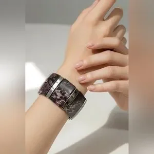 Translucent Iridescent Purple Snakeskin Lucite and Polished Silvertone Bars Stretch Bracelet