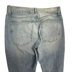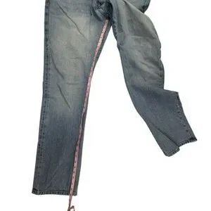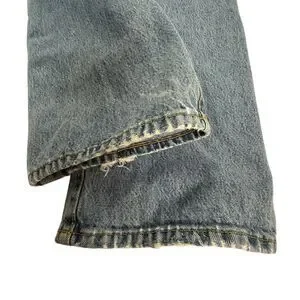 There is wear at the inner thighs, back seam, hems, pockets, zipper and aged discoloration on the waist.